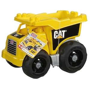 Cat large dump truck with a moveable bin that tilts back to dump out blocks Includes 1 construction worker figurine and 25 bloc