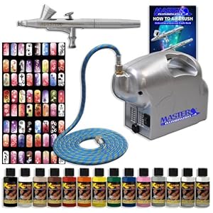 Master Pro Nail Art Precision Dual Action Airbrush Set with Master Airbrush Model TC-16 Air Compressor, Stencils, and 12 Paints, 6 Foot Braided Air Hose with 1/8" Fittings, and (FREE) How To Airbrush Guide